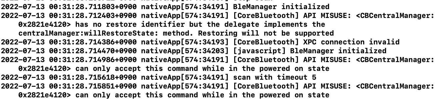 [CoreBluetooth] API MISUSE: <CBCentralManager: 0x2821e4120> has no restore identifier but the delegate implements the centralManager:willRestoreState: method. Restoring will not be supported