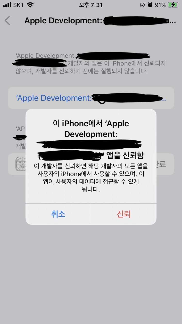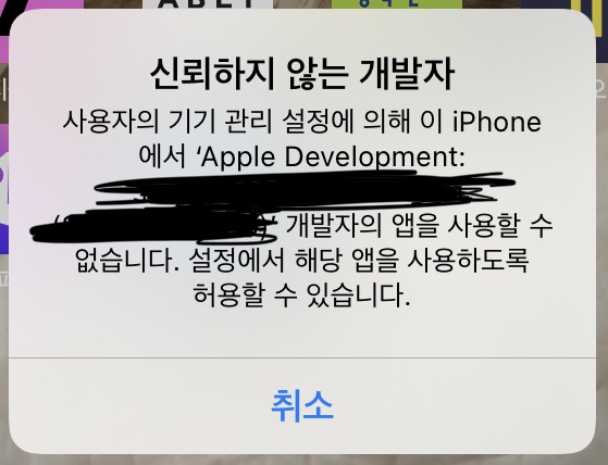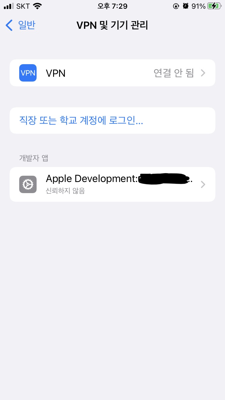 iPhone 설정 - 일반 - VPN 및 기기 관리 - 개발자 앱